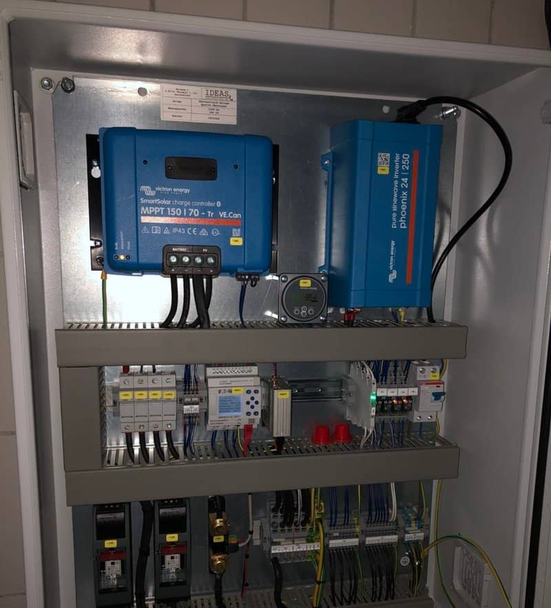 After months of work: evaluating the farm’s grid power consumption, followed by design then build of the containerised battery based power system – the time finally arrived to demonstrate the resilience of the Puiul Dobrogean poultry farm’s 180kVA private power plant …by disconnecting the electricity grid whilst the power consumption was running at 141kW! Nothing happened. In a good way. The load was transferred to the battery-based energy installation without so much as a flicker! The Romanian poultry farm consumes 1.5MWh of energy per day in the height of summer and had been relying on two back up generators to overcome grid failures; but when one of the generators failed to start – endangering livestock – it was clear that there was a vulnerability which could not be tolerated. Ionel Dobre – the owner of Puiul Dobrogean farm – started his business in 2012 and has expanded it steadily. For him this realisation of energy insecurity brought with it an opportunity – to make a financial investment to drastically reduce energy costs at the same time as guaranteeing energy security. The new installation is projected to supply between 93% and 95% of the farm’s energy consumption. (L) Ionel Dobre (R) Ovidiu Stan Ovidiu Stan is the General Manager at Stoneage Energy – who are based in Cluj-Napoca, Romania – and wanted to implement a technical solution which could charge this huge battery bank efficiently, and through all seasons – not just the summer. Based on the results Stoneage Energy had experienced with their previous large installations, they decided to increase the battery charging capacity by adding 12 MPPT solar chargers to the 12 Quattro Inverter/Chargers – to provide a additional 1200 amps of charging capacity. Storage: Over 1.3 MWh in 48V LiFePO4 batteries (Low Voltage). Low voltage was chosen for safety and because it allowed the use of the most robust inverters available. Inverters: 12 x Quattro Inverter/Charger 15000VA – capable of delivering 180 kVA and managing load peaks – 15000 models can actually handle 25000W peaks. AC/DC Architecture: A hybrid ecosystem using 300 kW of Fronius Tauro 100 inverters (AC-coupled) for direct daytime consumption and 12 SmartSolar MPPT 250/100 solar charge chargers = 1200 Amps (DC-coupled) to efficiently and directly charge the battery bank. PV panels: Over 600 bifacial panels rated at 645W (510 pcs on the 3 Tauros + 96 pcs on the 12 MPPTs) offer a total of ≈ 400 kWp. Monitoring: Cerbo GX & VRM Portal . Safety via Loop: The hall’s electrical grid was designed in an underground loop. If a cable is accidentally severed (e.g., by an excavator), power is supplied via the other arm of the loop, ensuring 100% continuity. AI Automations with Node-RED : Node-RED Temperature de-rating and shutdown code The system features several innovations developed by Stoneage Energy engineers specifically for large projects like this one, including: A huge pre-charge & emergency shutdown system, controlled by in-house software for controlling and monitoring more than 100 parameters of the whole system. Rapid shutdown & pre-pre-charge: For complete system disconnection in the unlikely event of any fault. Dynamic Power Balancing: For large systems when solar production is low and/or the grid is weak or unstable. Battery protection mode: Maintains a useful power reserve for power outages or a low next day power harvest forecast, consumption, and grid energy costs. Ionel says “Energy is monthly business cost. Once you install a system like this, that cost becomes an investment – this equipment is built to last 15-20 years.”