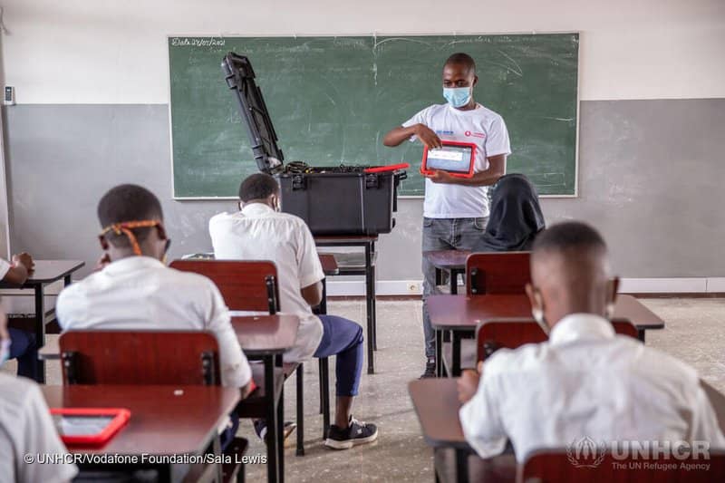 The headline photo, and the one above are courtesy of Vodafone Foundation/UNHCR. UNHCR and Vodafone Foundation’s Instant Network Schools programme aims to connect refugee students in a quality digital education and improve ICT literacy and digital skills. Vodafone Foundation’s Instant Classroom – the equipment used for INS – is a digital ‘school in a box’ that can be set up in a matter of minutes. It includes 25 tablets, a laptop for the teacher, a projector, speakers, 3G modem and a library of digital educational resources and is helping shape UNHCR’s Connected Education approach. The INS programme has had a significant impact within the schools in refugee contexts by ensuring that refugees, and the communities that host them, have access to accredited, quality, and relevant learning opportunities.