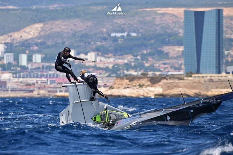 Odile and Annette, who have so many year’s experience of the 49erFX, found the near-wreck experience quite scary with the result that their mindset was to be cautious in the windy conditions during their competition sailing …an approach which is least likely to win races! It’s also a bad strategy when upholding your title as World Champions!