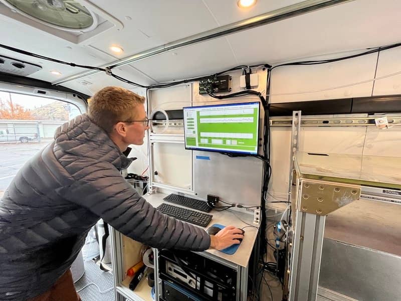The van has a power bank to run lab equipment at the same time as allowing other groups to charge drones for scanning fire fronts. They use a WiFi network to help teams stay connected in the field.