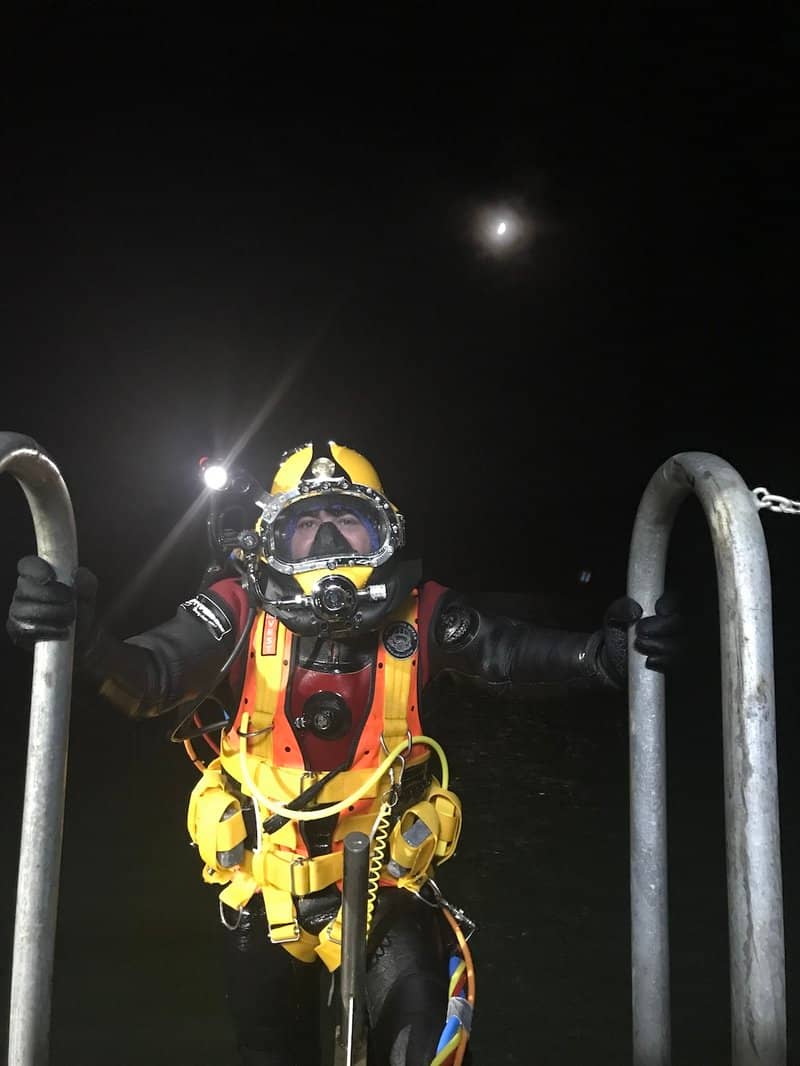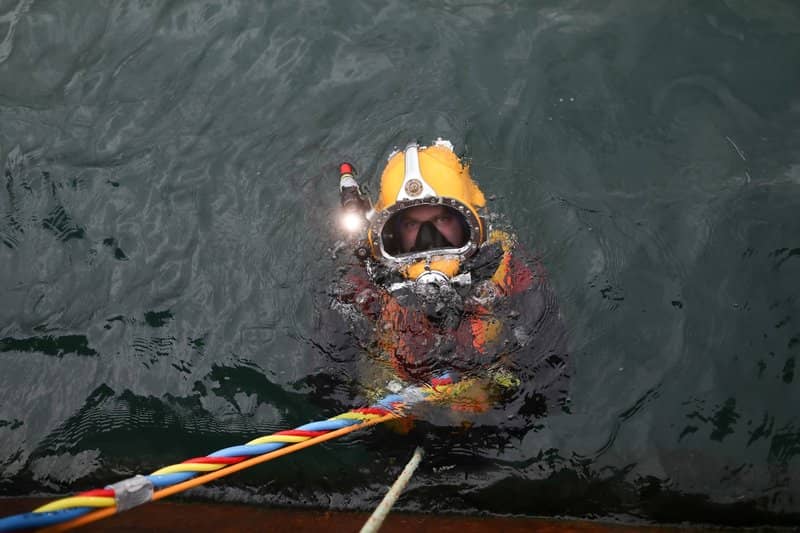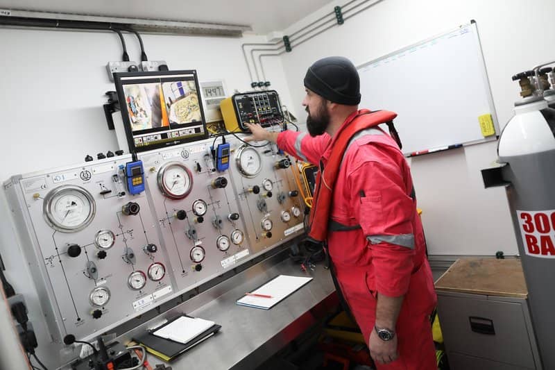 In addition to heavy weight mechanical devices, such as electric cranes, lifting gear, air compressors, the dive training barge has a decompression chamber together with associated breathing support devices to which a stable electricity supply is critical. There is also welding gear, and because a significant part of the barge’s work includes night time training – its lighting systems are also essential.