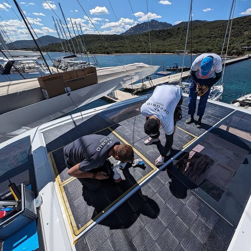 The customised solar panels can be walked-on and have a non-slip textured surface. All cabling is concealed beneath the modules so that the system is perfectly integrated into the lines of the ship. The system on the hardtop in particular is virtually invisible from the outside; this solar field already supplies 1,446 Wp.