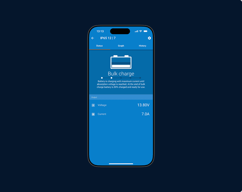 适用于 Android 或 iOS 的免费 VictronConnect 应用程序可让您调整充电配置文件、跟踪实时状态和查看使用历史记录,因此您可以无需触摸充电器即可保持充电状态。