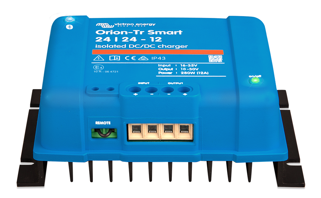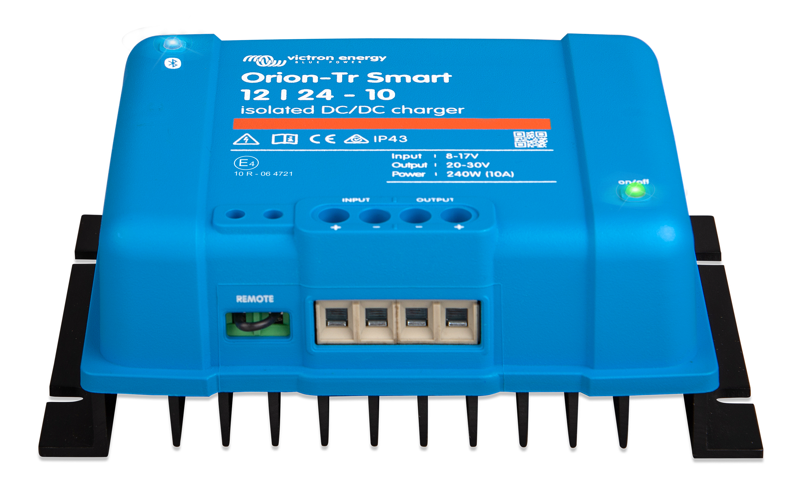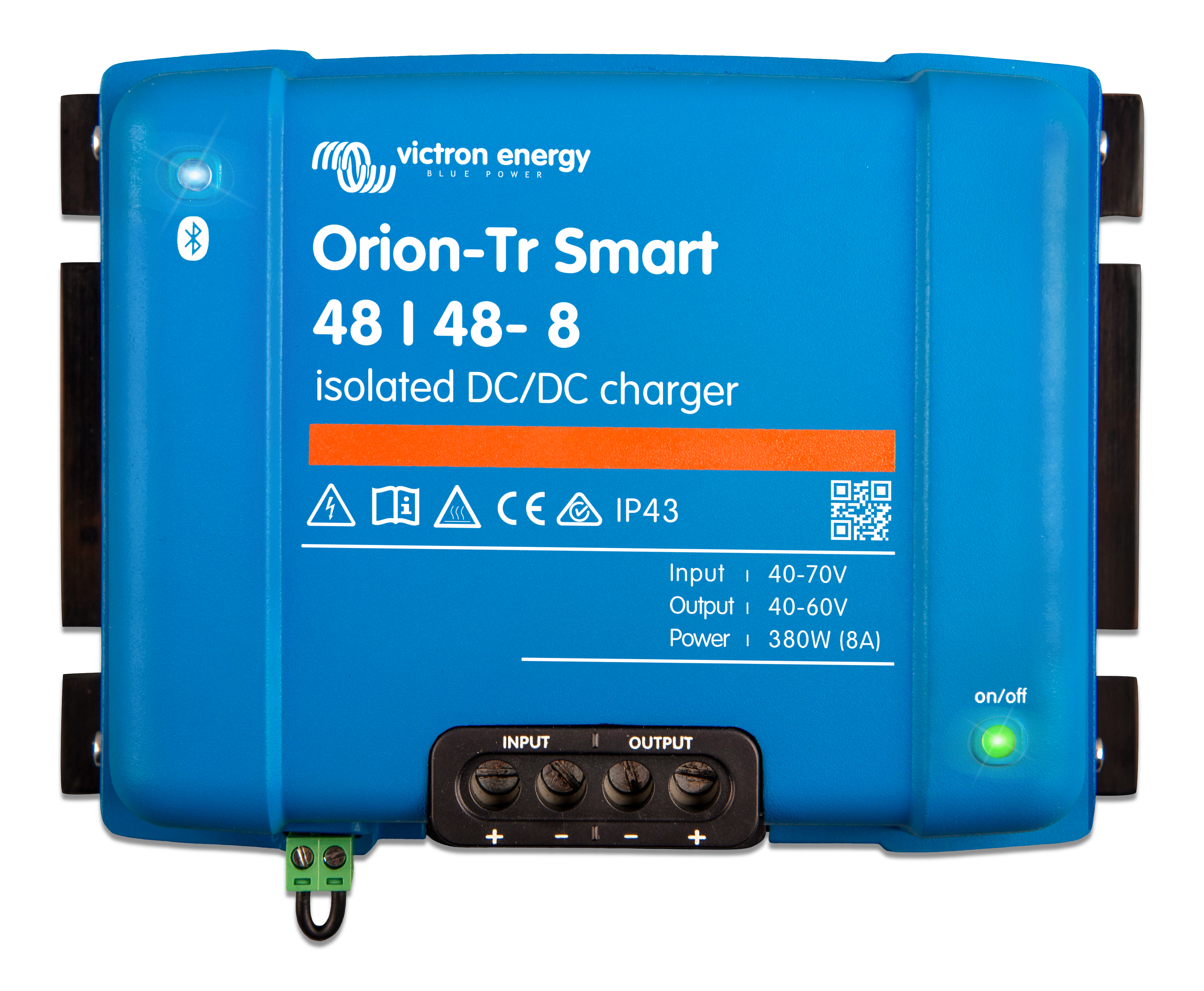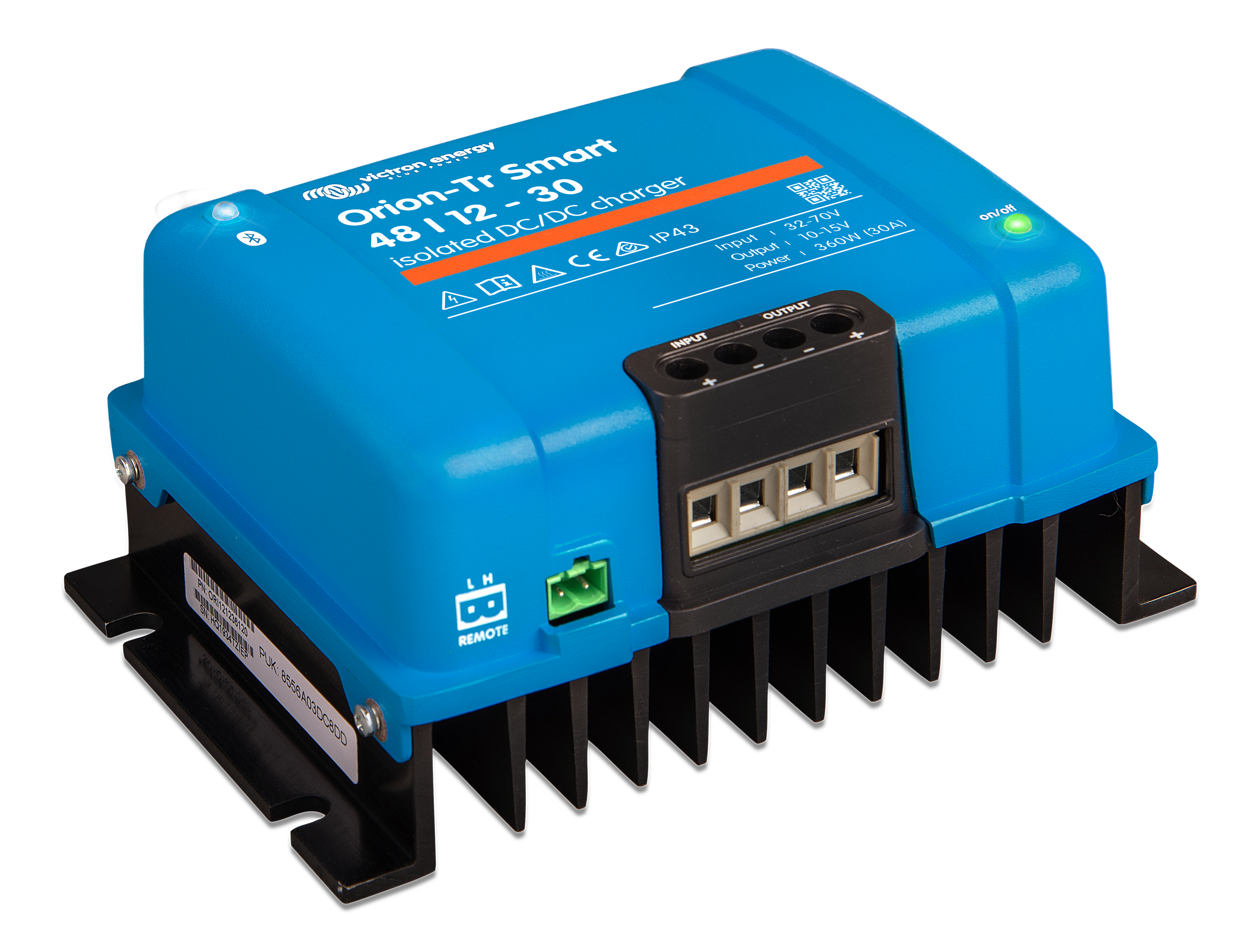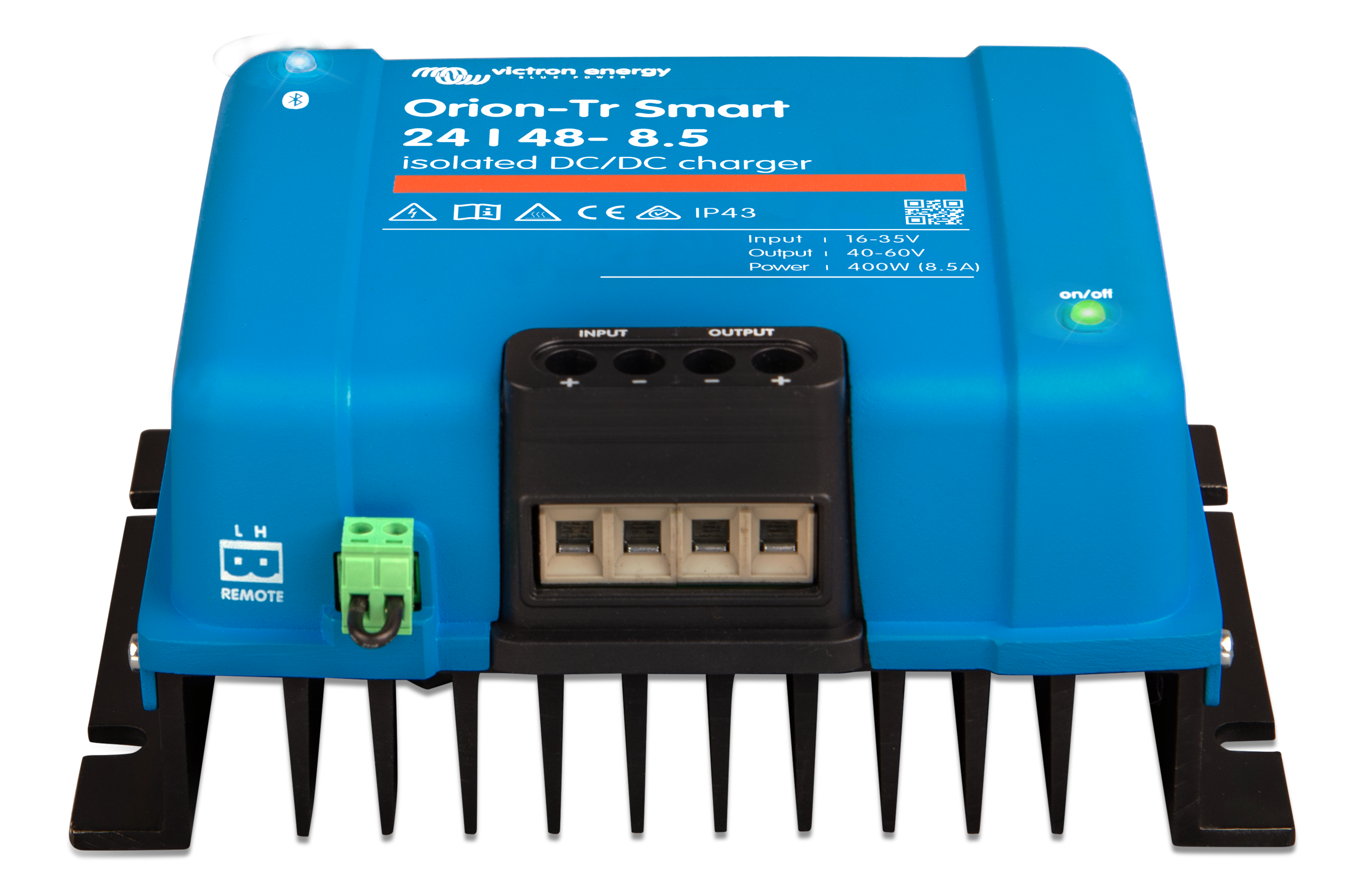 Orion-Tr智能充电器可用于12V, 24V或48V系统,适用于铅酸电池和锂电池。型号可达400W,可并联无限多个电池组,增加输出功率。