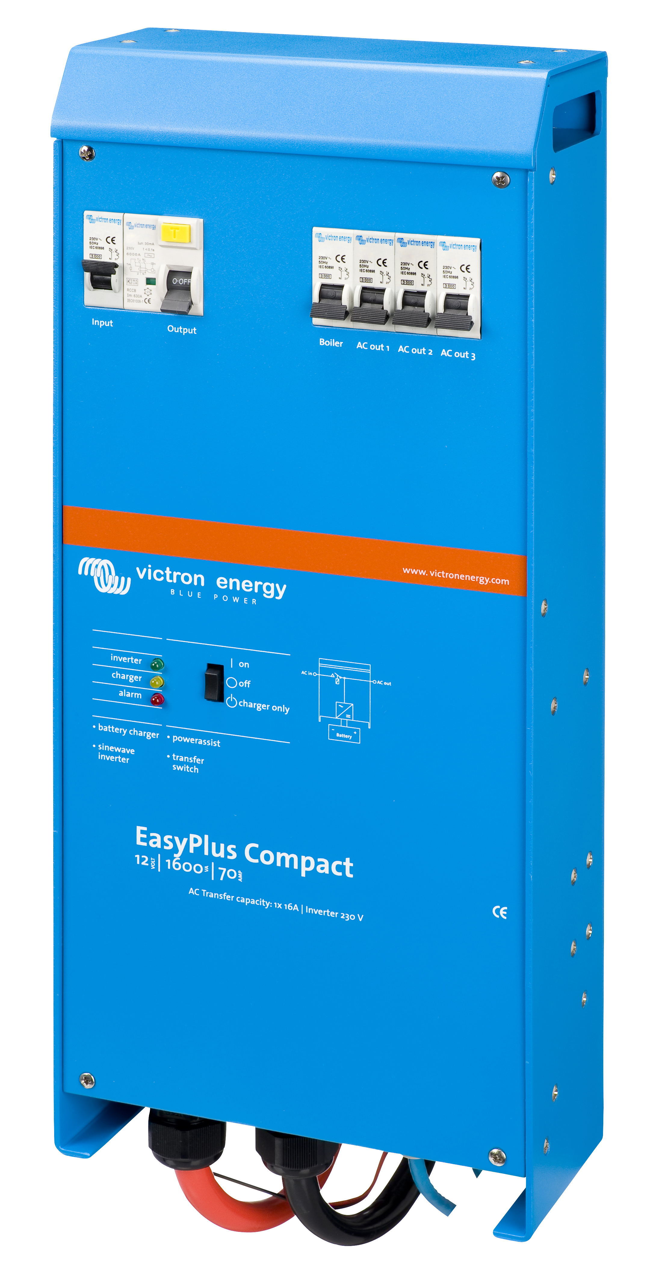 EasyPlus 是一个轻便紧凑的多功能能源系统,由一个强劲的正弦波逆变器、精致的电池充电器、一个高速AC(交流电)转换开关和AC分配系统组成。该系统是为希望得到完整能源体系统的舒适和自由,而不需要花时间安装单独的零件和难理解的技术程序。